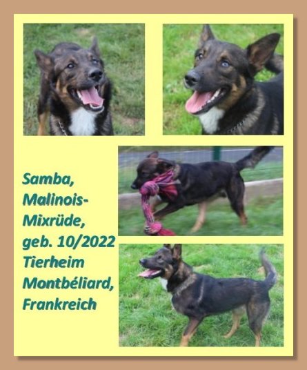 Geschlecht: männlich Geburtsdatum: 10/2022 Deutschsprachige Kontaktperson: Sandra Hummel Sans frontières - grenzenlose Hilfe für Tiere - D-79104 Freiburg (Sitz des Vereins) E-Mail: Bitte per Kontaktformular anschreiben Homepage: http://www.grenzenlose-hundehilfe.de Standort des Hundes: Tierschutzhof CANIMA (Nähe Belfort /France) Februar 2025: Leider ist unser hübscher Samba wieder zurückgekehrt, da die neuen Besitzer sich das Leben mit ihm anders vorgestellt hatten und schnell überfordert waren. Diese Überforderung hat zu vielen Missverständnissen zwischen seinen Menschen und Samba geführt, die letztlich mit gegenseitigem Misstrauen endeten und nicht mehr aufzulösen waren. Samba ist daher auf der Suche nach einem Zuhause, welches ihm Strukturen und viel Sicherheit bietet und auch dann, wenn es mal zu viel für ihn wird, ihm mit Ruhe und Klarheit begegnen kann. Samba kann, wenn er zu sehr sich selbst überlassen wird und keine Führung erfährt, nämlich durchaus auch mal überfordert sein und wird dann hektisch. Dieses Verhalten zeigt er bei Canima kaum, weshalb wir überzeugt sind, dass er mit Menschen die ihn souverän durch das Leben begleiten und ihm einen Rahmen bieten, der ihm Halt gibt, ein wunderbarer Begleiter werden. Wenn diese Basis erst einmal erarbeitet ist, möchte er sich auch gerne mit seinen Menschen beschäftigen und freut sich, wenn er seine Fähigkeiten ausbauen darf (z.B. Fährte oder Mantrailing könnten wir uns gut für ihn vorstellen). Der hübsche Rüde kann gut im Auto mit fahren und ist stubenrein, mit seinen Bezugspersonen genießt er außerdem auch gerne mal eine Kuscheleinheit. (sh) Oktober 2023: Samba ist ein junger Malinois - Mixrüde, der im Oktober 2022 geboren wurde. Die Anfangszeit im Tierheim war für Samba gruselig. Da er wenig in seinem Zuhause gelernt hatte, war er in der neuen Umgebung überfordert. Die Geräuschkulisse im Tierheim war für ihn gewöhnungsbedürftig und die vielen Hunde machten ihn nervös. Nach und nach entdeckte er die Umgebung und fing an, die Spaziergänge für sich zu entdecken. Er hat Freude daran, wenn man mit ihm spielt und überhaupt findet er Aktivitäten mit den Menschen einfach toll. Samba mag es auch zu schmusen, denn er ist sehr anhänglich und mag die Menschen sehr! Mit Artgenossen und Katzen sei er, laut Tierheim, nicht verträglich. Der gerade einmal einjährige Rüde sucht Menschen, die es wirklich ernst mit ihm meinen. Menschen, die die Arbeit mit ihm nicht scheuen werden und Freude daran haben, aus dem jungen Burschen einen treuen Begleiter zu formen! Update November 2023: Wir haben Samba zusammen mit seinem Gassigeher nach einem Spaziergang getroffen. Bildschön ist der freundliche Bub. Als wir nachfragten, wie genau seine Geschichte lautete, wurde erzählt, dass er ein Geschenk für einen 13 Jährigen war. Da aber der vorhandene Hund der Familie immer auf Samba los sei und ihn auch gebissen hatte, musste Samba ins Tierheim. Für so einen jungen Burschen ist das Tierheim der allerschlimmste Platz. Niemand kann sich adäquat um ihn kümmern. Niemand hat Zeit, sich richtig und ausgiebig mit ihm zu beschäftigen. So sind seine einzigsten Highlights die Spaziergänge am Nachmittag und Ball spielen. (mh) |